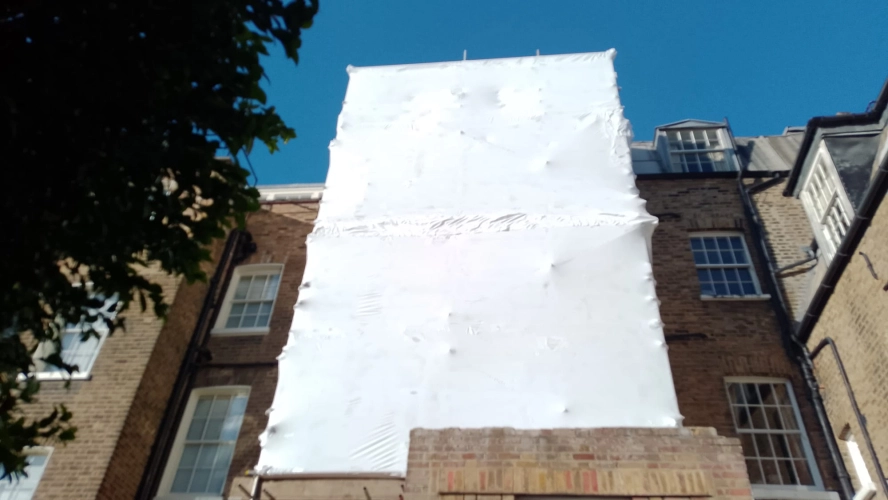 Shrink wrap scaffolding installed around property in Chelsea SW3, providing full weather and dust pr...